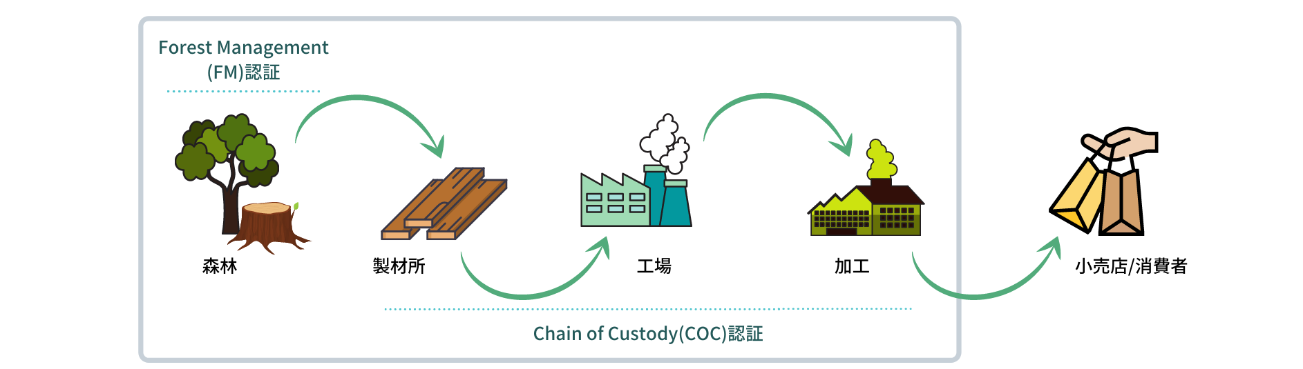 FSC®認証は森林から伐採、製造まで全ての素材と業者が認証ライセンスを保有することが条件となります。